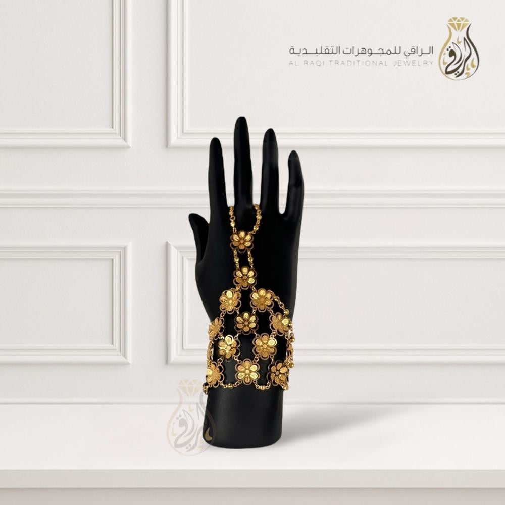 كف أنيق من بديل الذهب بتصميم تراثي مستوحى من الزخارف التقليدية، مزين بزهور ذهبية مترابطة بأناقة لتضفي إطلالة ملكية على اليد. يجمع بين جمال التراث وروعة التفاصيل العصرية، مما يجعله قطعة مثالية للمناسبات الخاصة والسهرات. تصميمه الفريد يزين اليد بشكل كامل ليمنحك حضوراً مميزاً يخطف الأنظار.
