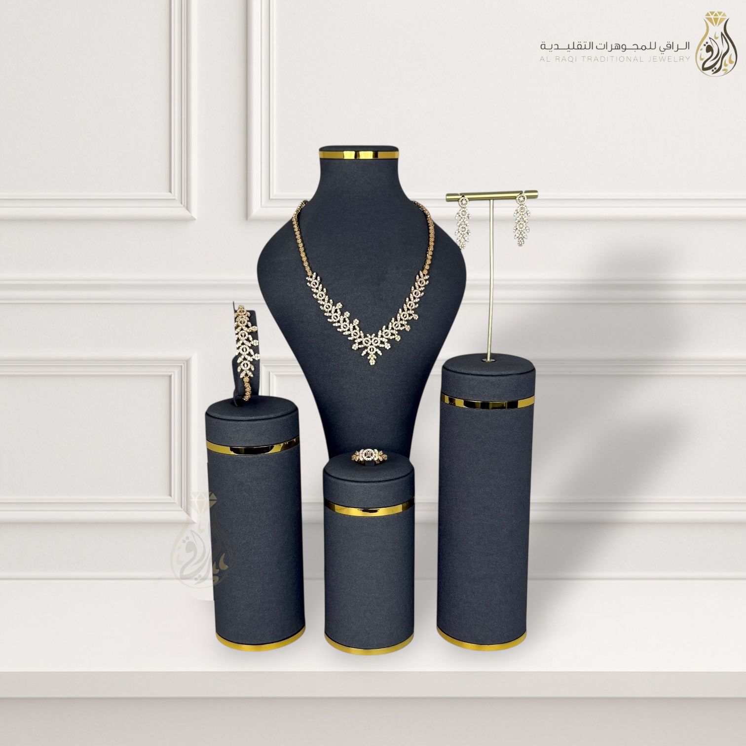 يضم الطقم عقداً أنيقاً، سواراً متناسقاً، خاتماً فخماً، وأقراطاً بتصميم متدلٍ لتكملي إطلالتك في المناسبات الخاصة والسهرات الفاخرة.