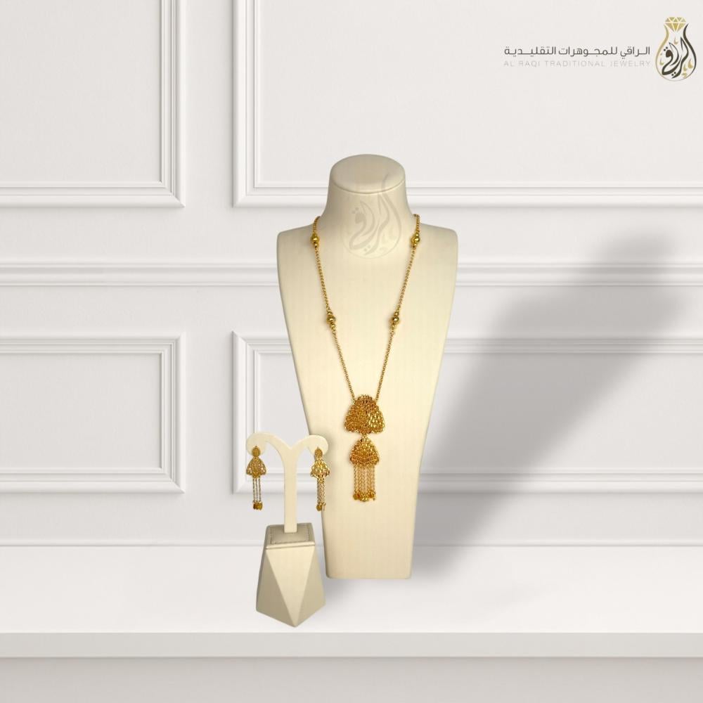 الحلق: متناسق مع القلادة، بتصميم متدلٍ يضيف لمسة فاخرة وبارزة.