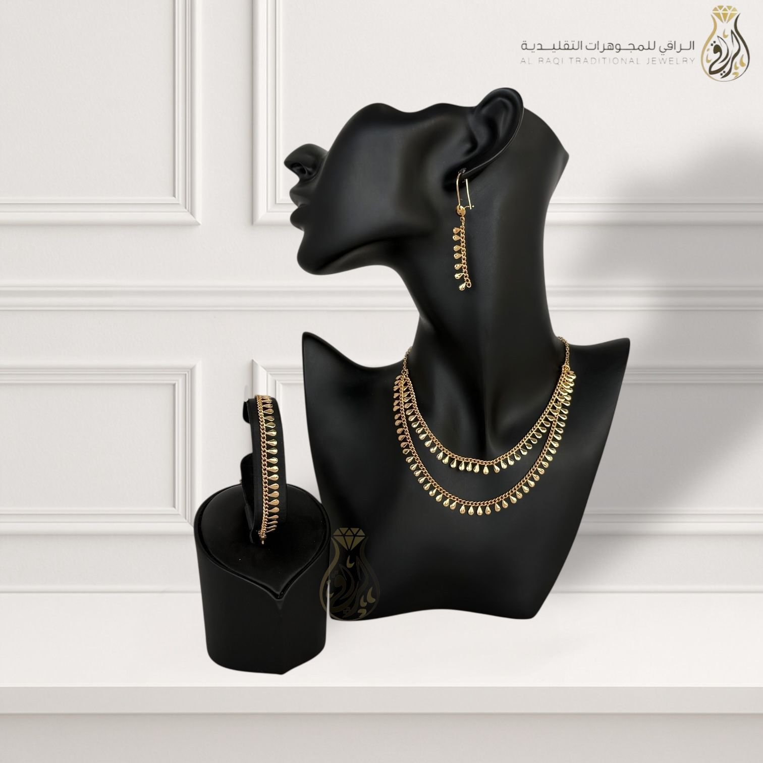 طقم بديل ذهب فاخر بتصميم تقليدي مستوحى من جمال التراث العربي الأصيل. يتكوّن من عقد متدرج الطبقات مزين بسلاسل صغيرة متدلية تضفي حركة أنثوية جذابة، مع بناجر وقرطين بنفس اللمسة المتناسقة. يجمع هذا الطقم بين اللمسة الكلاسيكية والبريق العصري ليمنحك حضوراً فريداً في المناسبات الخاصة والمظهر اليومي الراقي.