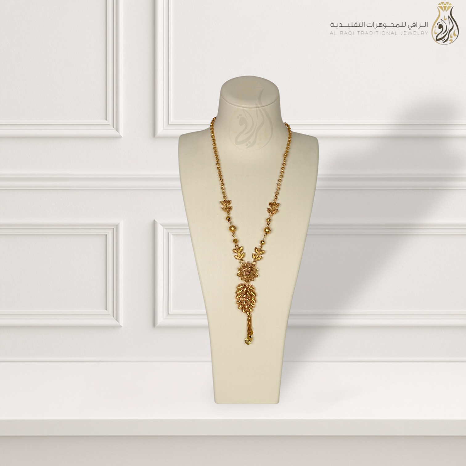 العقد من الرّاقي للمجوهرات التقليدية يتميز بتصميم نباتي أنيق مستوحى من الزخارف التراثية.