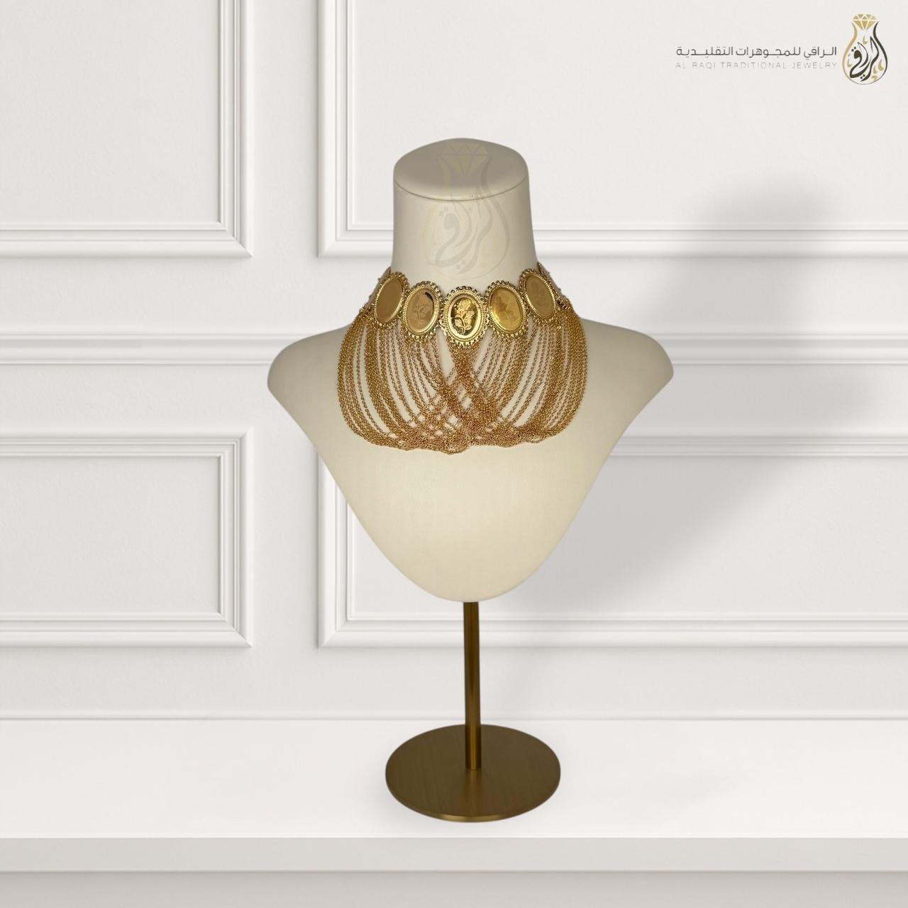 مزنط فاخر من بديل الذهب يجمع بين الجمال التراثي والفخامة العصرية. يتميز بتصميمه المميز الذي يضم صفًا من العملات البيضاوية الكبيرة المزخرفة بإتقان، تتدلى أسفلها سلاسل ذهبية متعددة الطبقات تمنح العنق إطلالة ملوكية راقية. قطعة أنثوية فخمة تعبّر عن الأصالة العربية وتضفي لمسة من الجمال والهيبة على إطلالتك في المناسبات الفاخرة والأعراس.